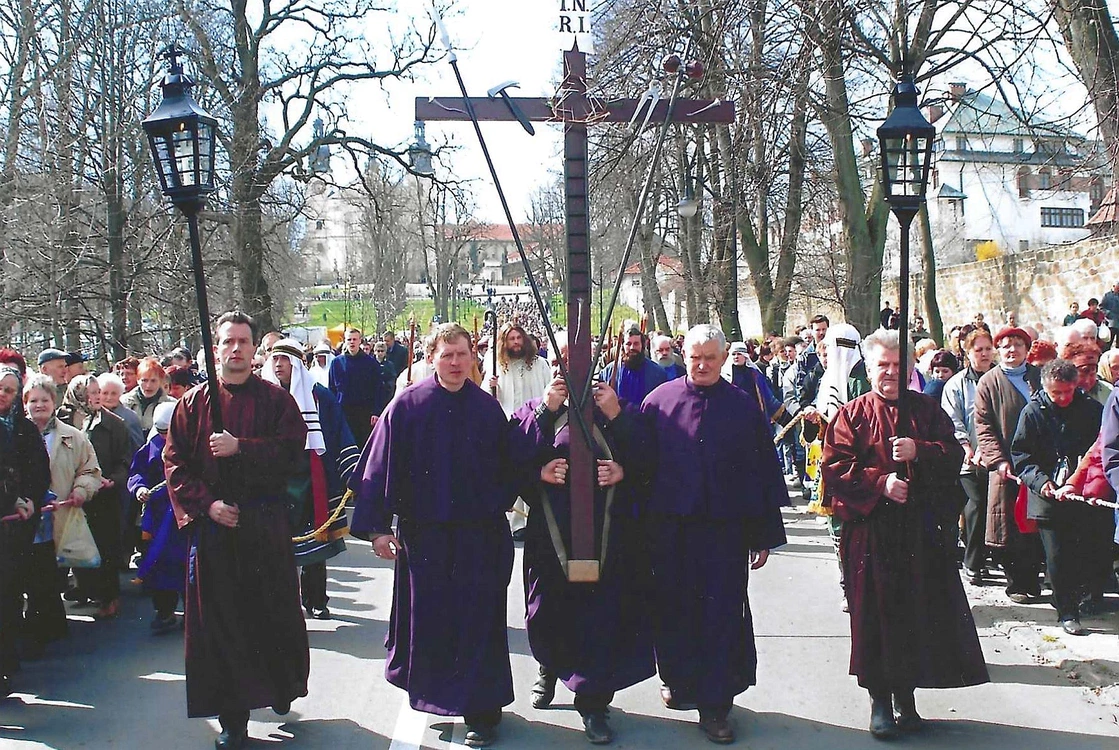 Pana Jana niosącego krzyż można też spotkać w Kalwarii podczas wielkotygodniowych Misteriów Męki Pańskiej. W 1990 r., pośród setek tysięcy pielgrzymów uczestniczących w misteriach, wypatrzył Stanisław Kozak, który od wielu już lat niósł krzyż, prowadząc Jezusa na kalwaryjską Golgotę. - Miałem wtedy 21 lat i - jak co roku - chodziłem po dróżkach z moją „kompanią” z Krzczonowa, gdzie mieszkam. Pan Stanisław poprosił, bym odtąd szedł obok krzyża, niosąc pochodnię. Nosiłem ją przez 5 lat - wspomina. Po takim przygotowaniu, w 1995 r., Jan Śliz został jednym z dwóch mężczyzn pomagających Stanisławowi Kozakowi w niesieniu krzyża. Pomagających, to znaczy trzymających go po bokach, bo wędrowanie z nim po dróżkach i po Drodze Krzyżowej (w najróżniejszych warunkach atmosferycznych, często po błocie, w deszczu, a nawet w śniegu) jest dużym wysiłkiem i wymaga kondycji fizycznej. Funkcję głównego niosącego krzyż (czyli pośrodku) objął w 2010 r. Obecnie w niesieniu krzyża pomagają mu parafianie z Krzczonowa Franciszek Tajs i Andrzej Pachura, a najbliższa rodzina, czyli żona Janina oraz trójka dzieci zawsze są gdzieś w pobliżu i modlitwą dodają mu sił. - Bardzo się cieszymy, że wchodząc w dorosłość, nasze dzieci mocno trzymają się wiary, a Kalwaryjska Pani zajmuje w ich sercach szczególne miejsca - wzrusza się Janina Śliz.