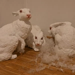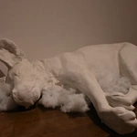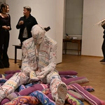 Niewątpliwie prezentowana wystawa i kilkanaście zawartych w niej prac, odsłania fragment procesu, o którym wspomina pani profesor. Prace artystyczne mają swój wyrazisty kształt, formę, przesłanie. Poznajemy smacznie śpiącego psa, oglądamy głowę człowieka bez części czaszki czy dorosłego wpatrującego się w światło albo też takiego, który siedzi na kolorowych zwiniętych materiałach, przypominających dziecięce dywaniki.